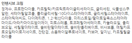 전성분) 정제수, 부틸렌글라이콜, 글리세린, 사이클로펜타실록산, 부틸렌글라이콜디카프릴레이트/디카프레이트, 에칠헥실이소노나노에이트, 하이드로제네이티드폴리이소부텐, 글리세릴스테아레이트, 1,2-헥산디올, 세테아릴알코올, 스테아릭애씨드, 폴리소르베이트60,폴리글리세릴-3메칠글루코오스디스테아레이트, 펜타에리스리틸테트라에칠헥사노에이트,스테아릴베헤네이트, 디메치콘, 디메치콘/비닐디메치콘크로스폴리머, 피토스테릴/이소스테아릴/세틸/스테아릴/베헤닐다이머디리놀에이트, 에칠헥실이소노나노에이트, 하이드록시프로필비스팔미타마이드엠이에이, 글라이코스핑고리피드, 메도우폼에스톨라이드, 콩스테롤, 세테아릴글루코사이드, 세라마이드에이피, 카프릴릭/프릭트리글리세라이드, 세라마이드이오피, 하이드로제네이티드폴리데센, 세라마이드엔피, 콜레스테롤, 하이드로제네이티드레시틴, 콜레스테릴석시네이트, 글리세릴폴리메타크릴레이트, 알류리틱애씨드,효모추출물, 글라이코프로테인,베타인,소듐하이알루로네이트,폴리쿼터늄-51, 코코넛오일,알로에베라잎추출물, 쉐어버터, 하이드록시에칠아크릴레이트/소듐아크릴로일디메칠타우레이트코폴리머, 스쿠알란, 카보머, 트로메타민, 토코페릴아세테이트, 글리세릴아미도에칠메타크릴레이트/스테아릴메타크릴레이트코폴리머, 알테로모나스발효추출물, 바실러스발효물, 프로필렌글라이콜,카카오씨추출물, 디프로필렌글라이콜, 라벤더오일, 자몽껍질오일,레몬그라스잎오일, 센티드제라늄오일, 오렌지껍질오일, 광곽향오일, 백단향오일, 캐모마일꽃오일, 나이아신아마이드, 알란토인, 디소듐이디티에이, 에칠헥실글리세린